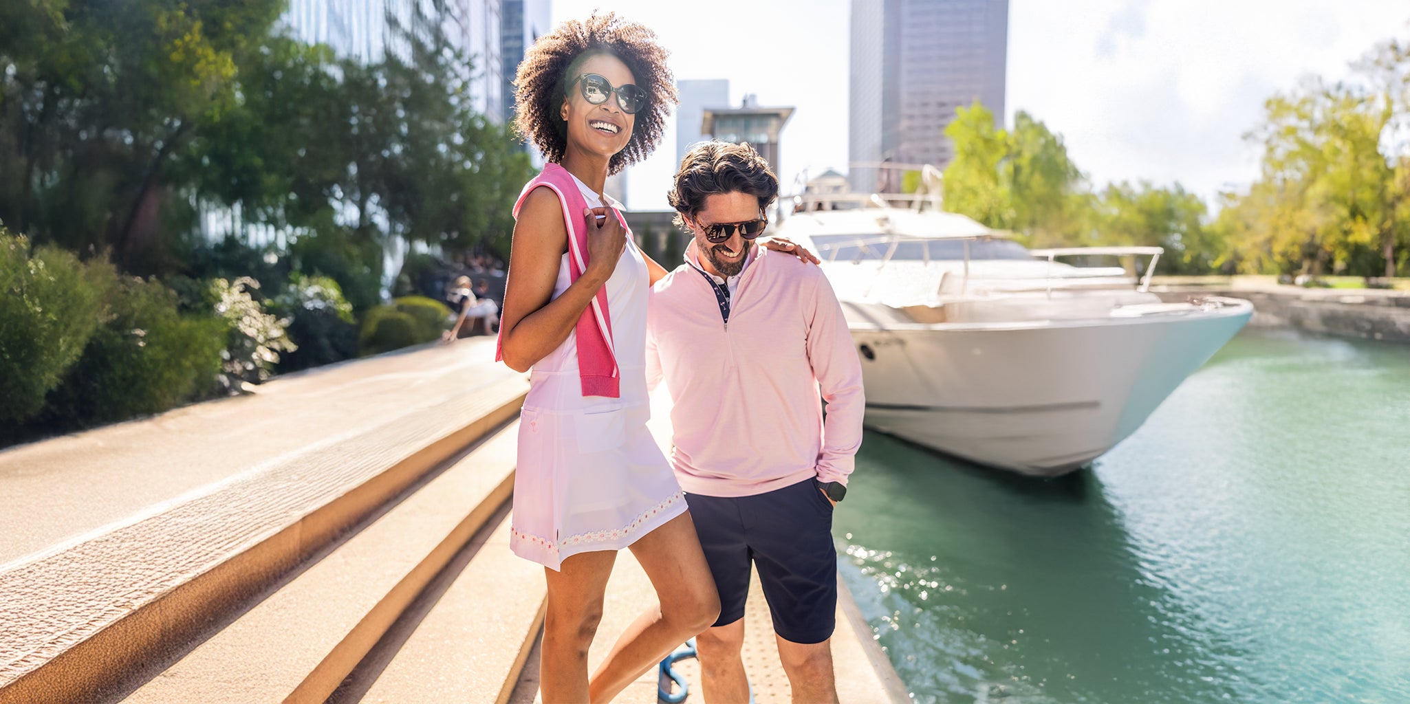 Introducing The Fighter Skort - This luxurious navy and pink ruffle golf skort features an elegant geometric design with two back scorecard pockets. The Fighter speaks to Breast Cancer Awareness Month. Join the fight and make a statement with The Fighter Skort.